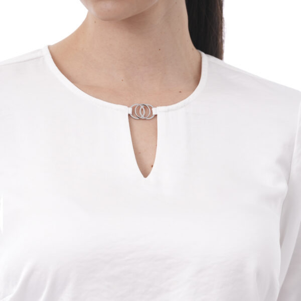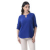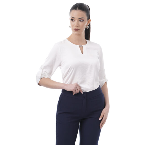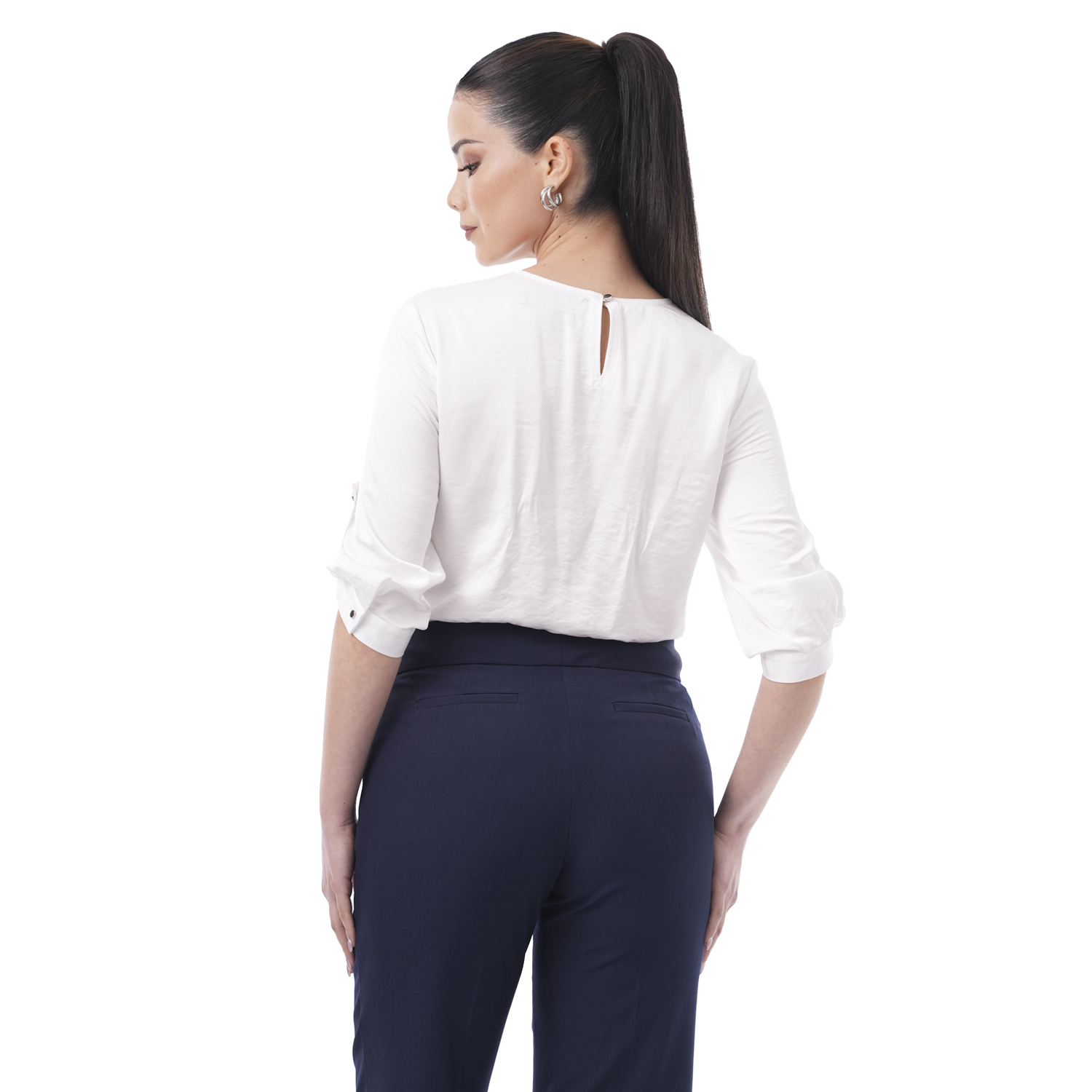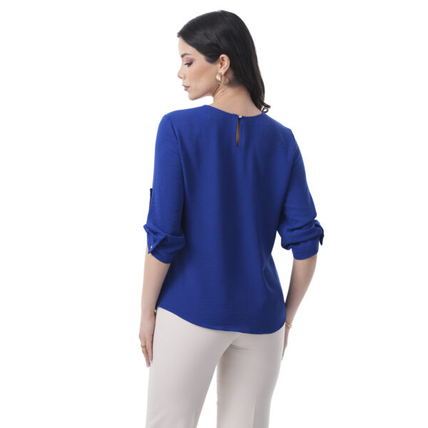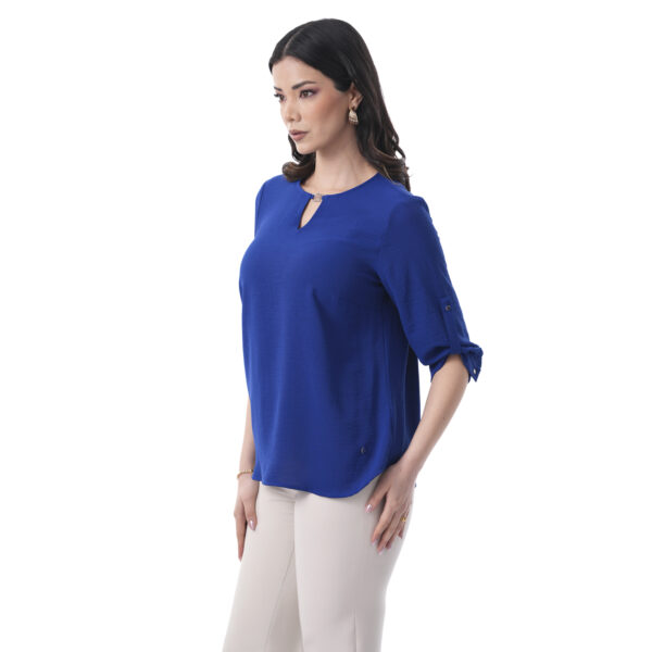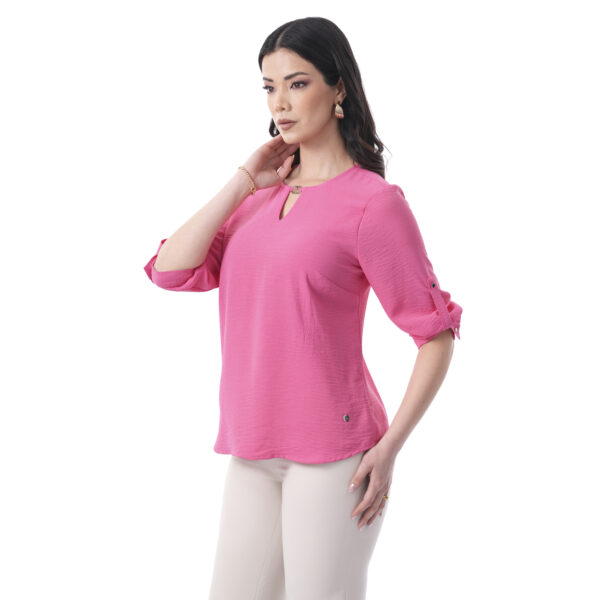 Esta blusa de color entero con detalle en el cuello aporta un toque sofisticado y versátil, ideal para complementar tus looks con elegancia y estilo.