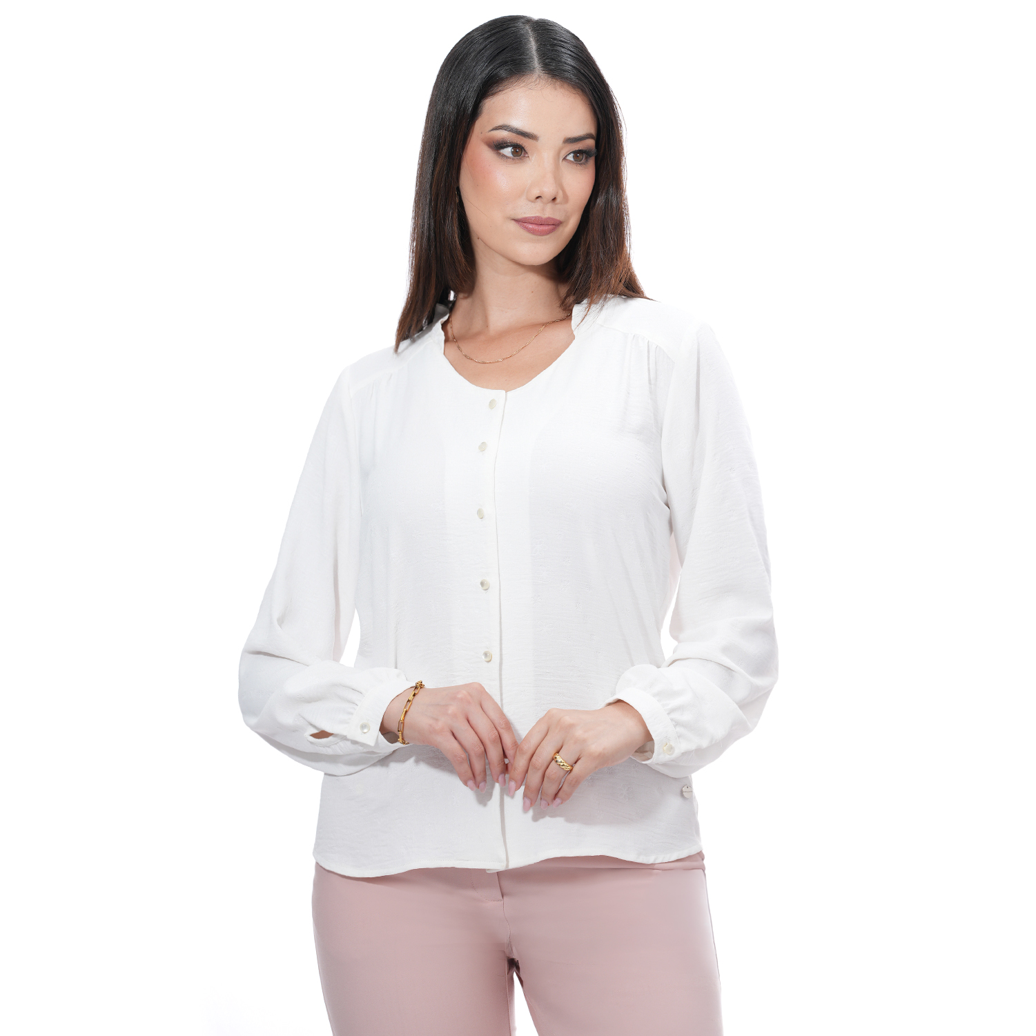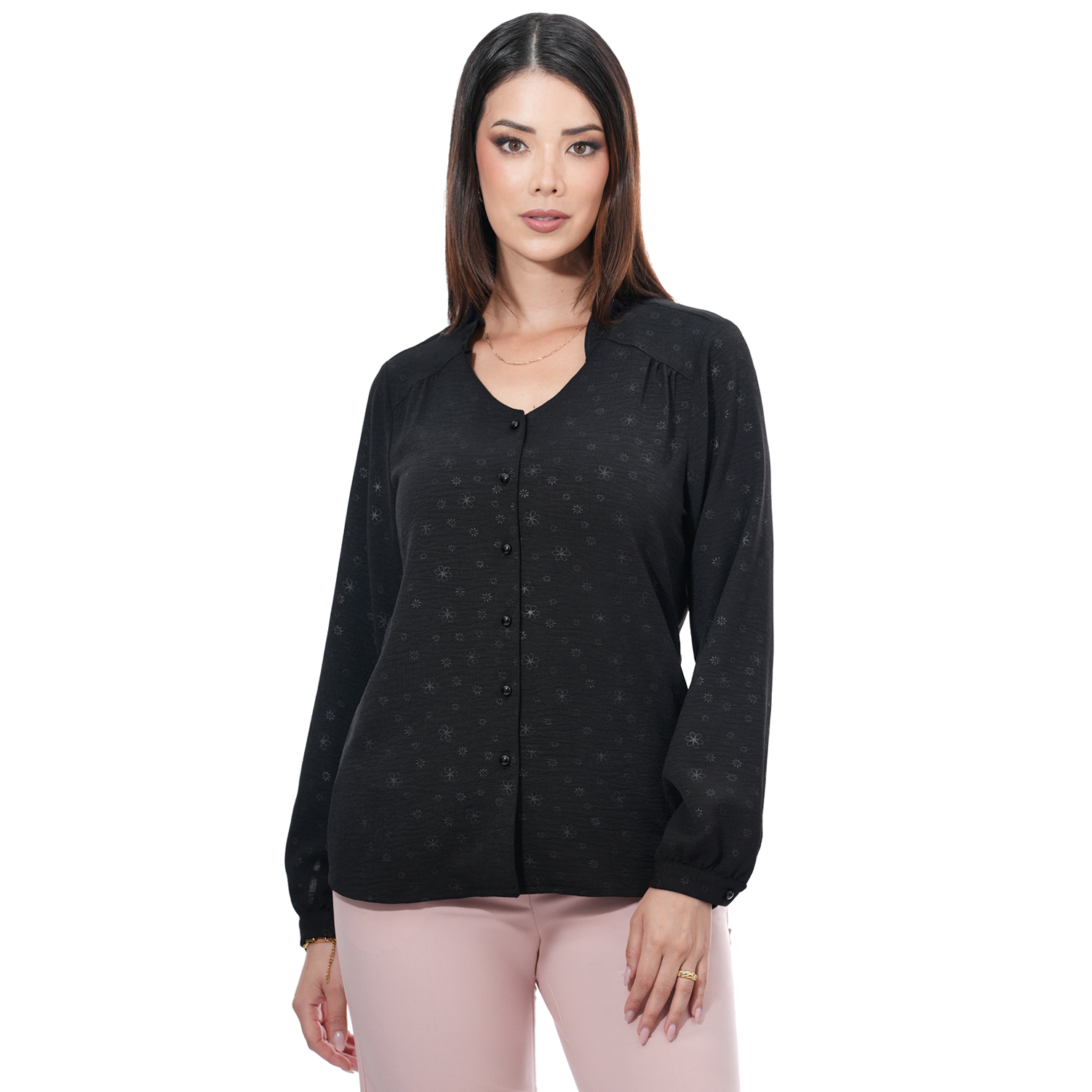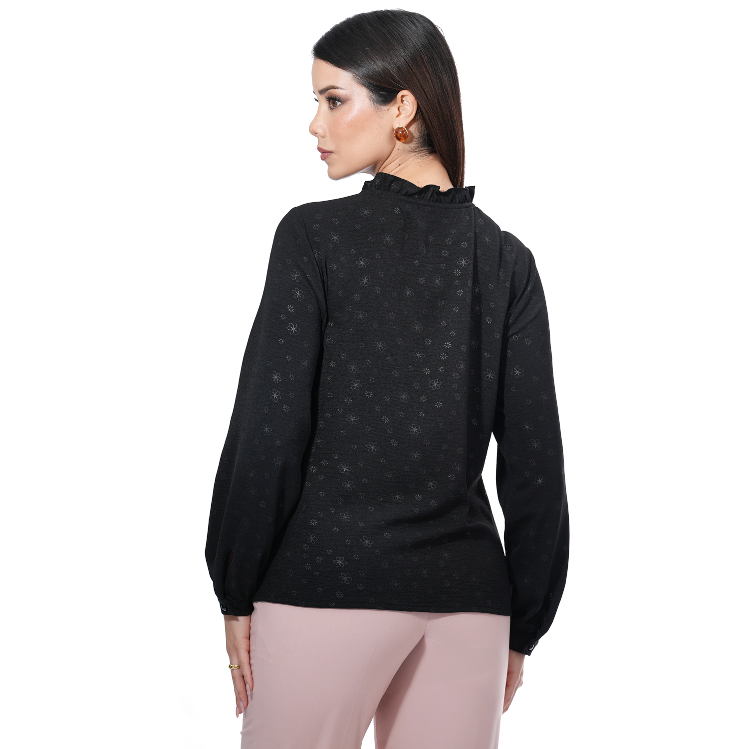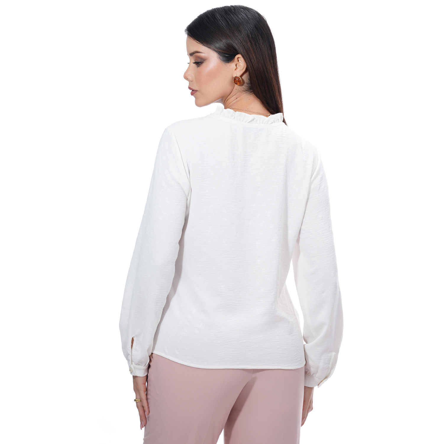 Blusa de color entero manga larga con delicados detalles que realzan su diseño.