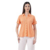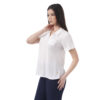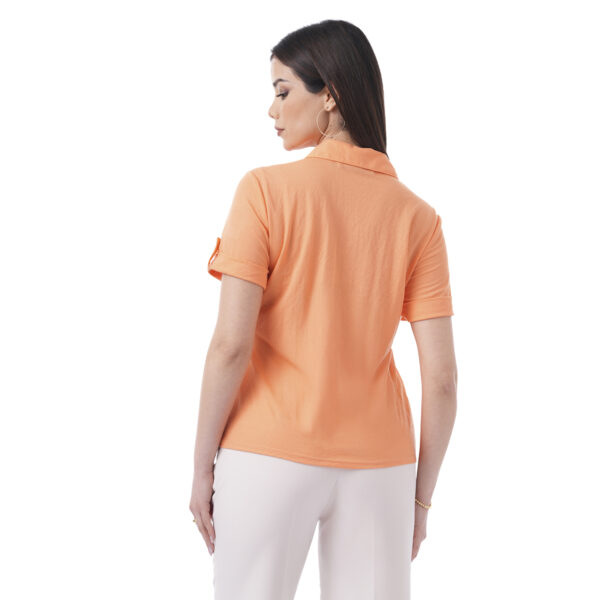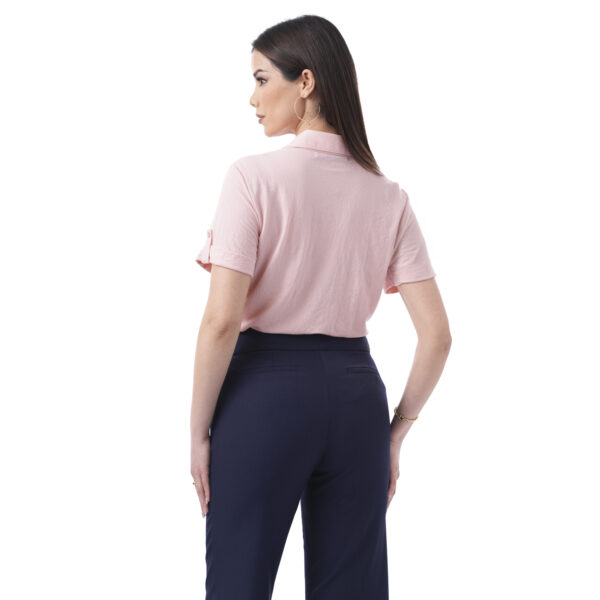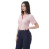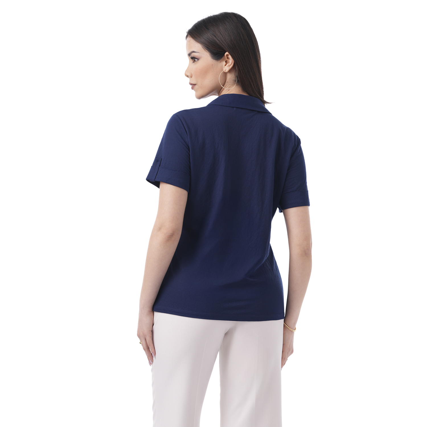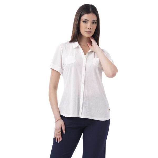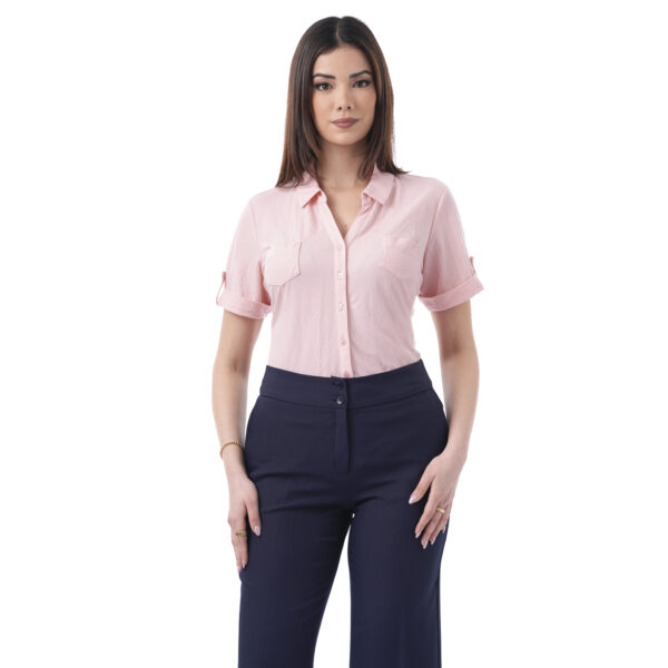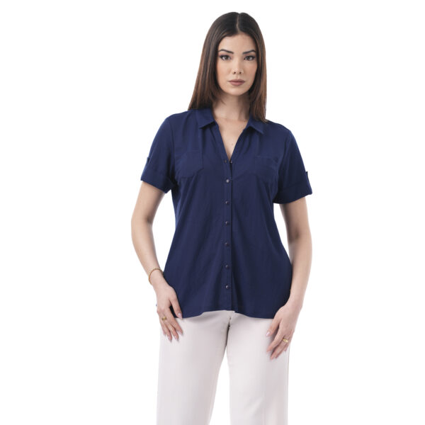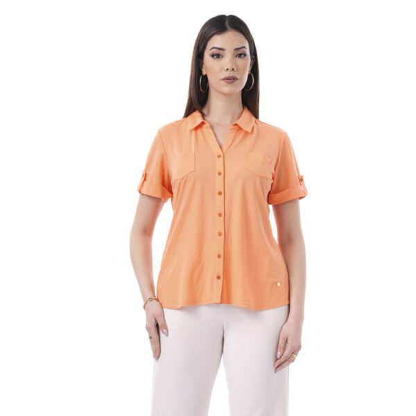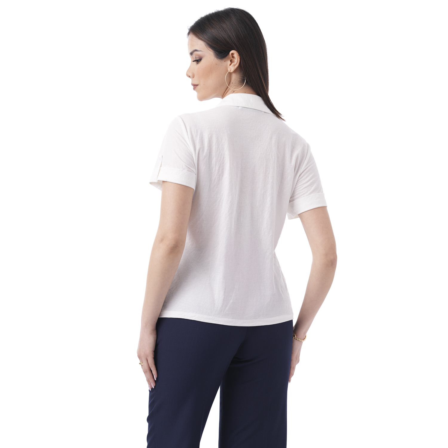 Esta blusa de color entero y manga corta es una prenda versátil y cómoda, perfecta para crear looks frescos y modernos.