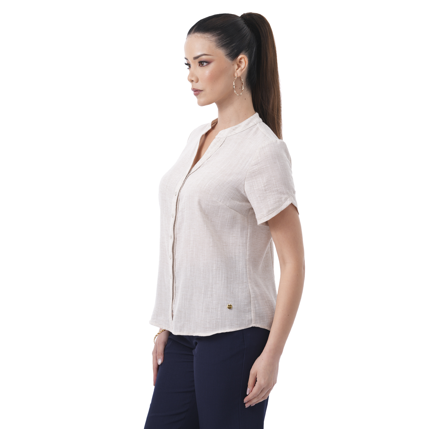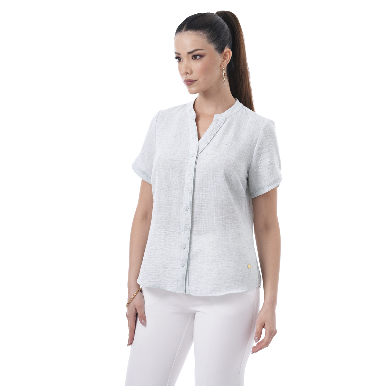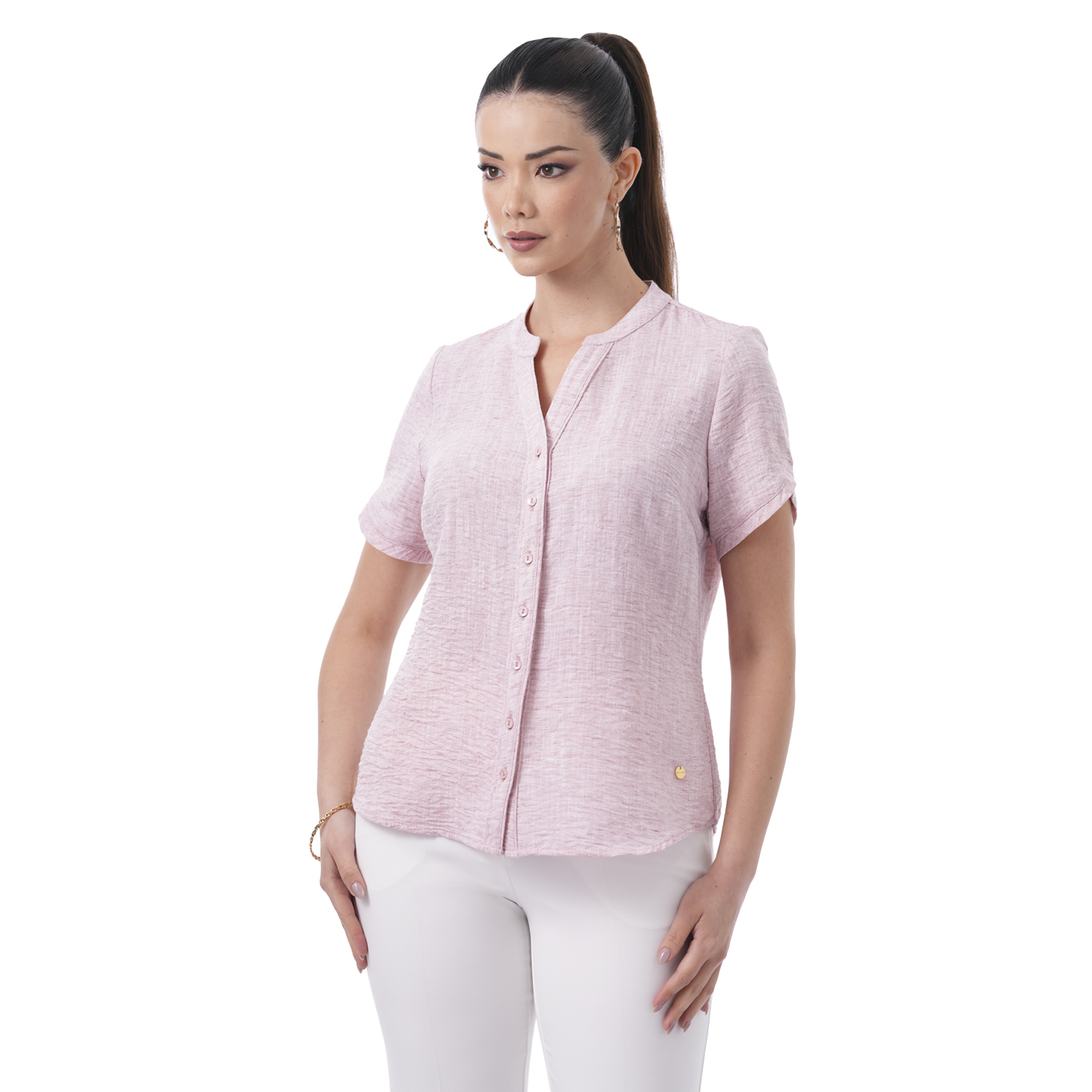 Esta blusa de color entero y manga corta combina sencillez y elegancia en un diseño atemporal.