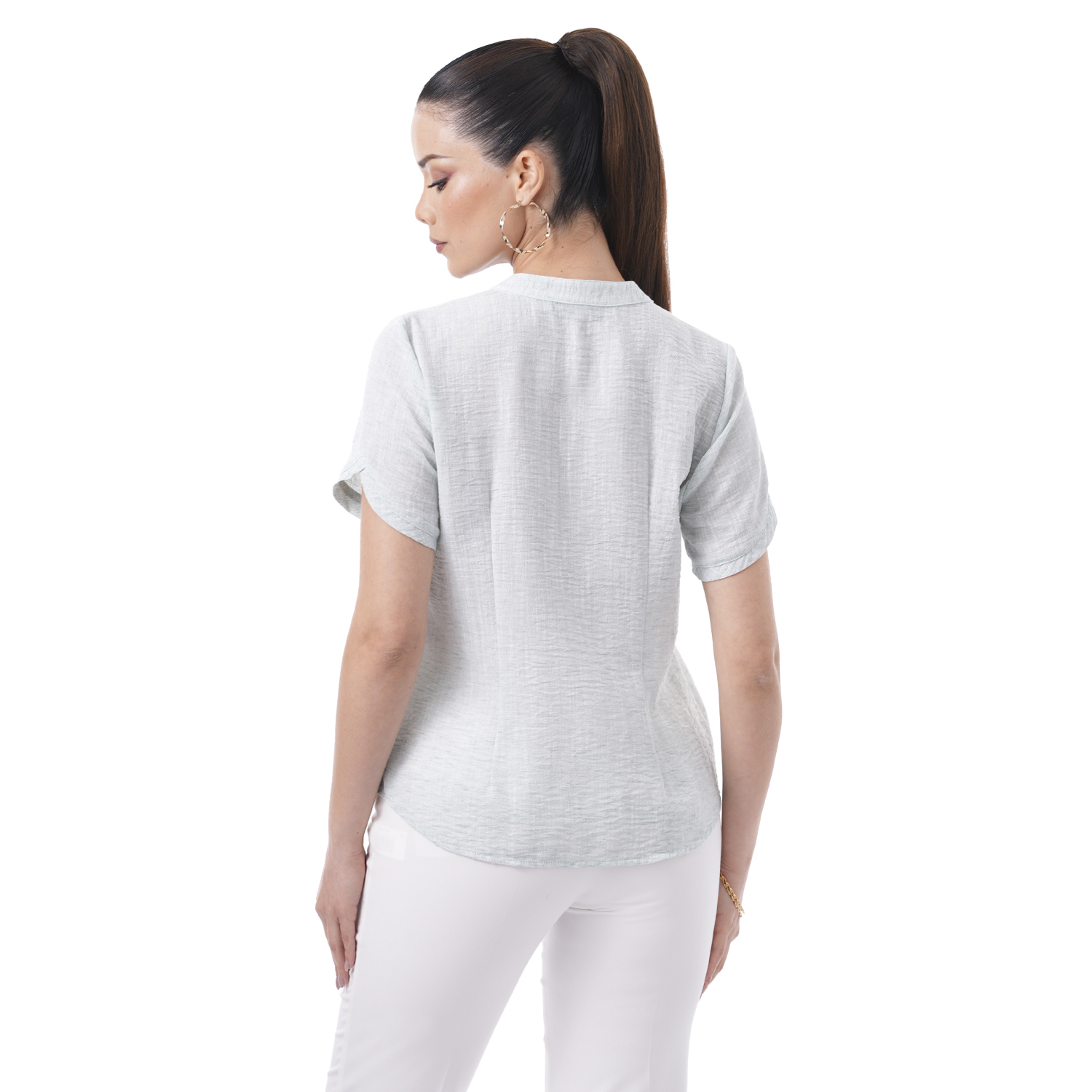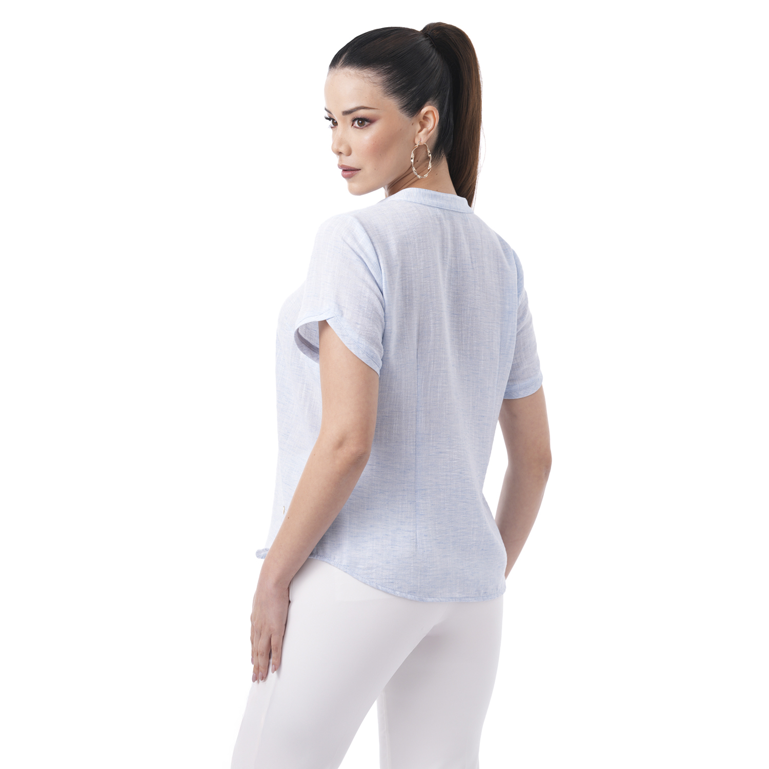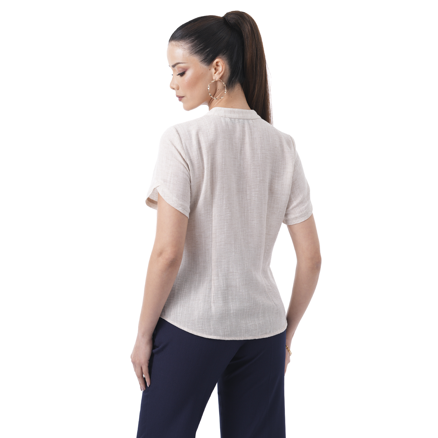 Esta blusa de color entero y manga corta combina sencillez y elegancia en un diseño atemporal.