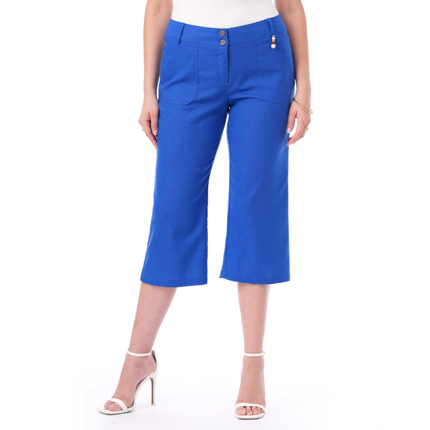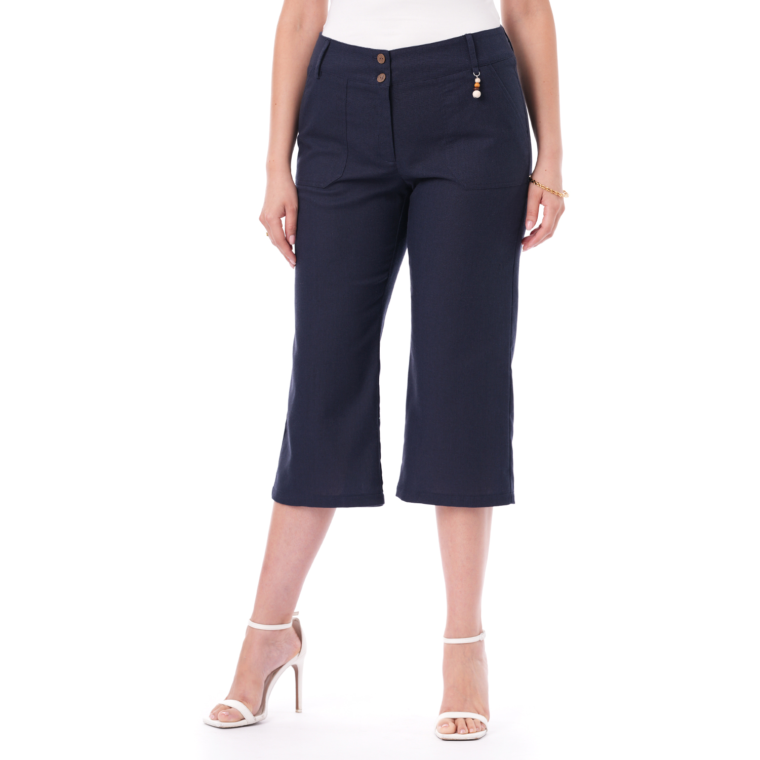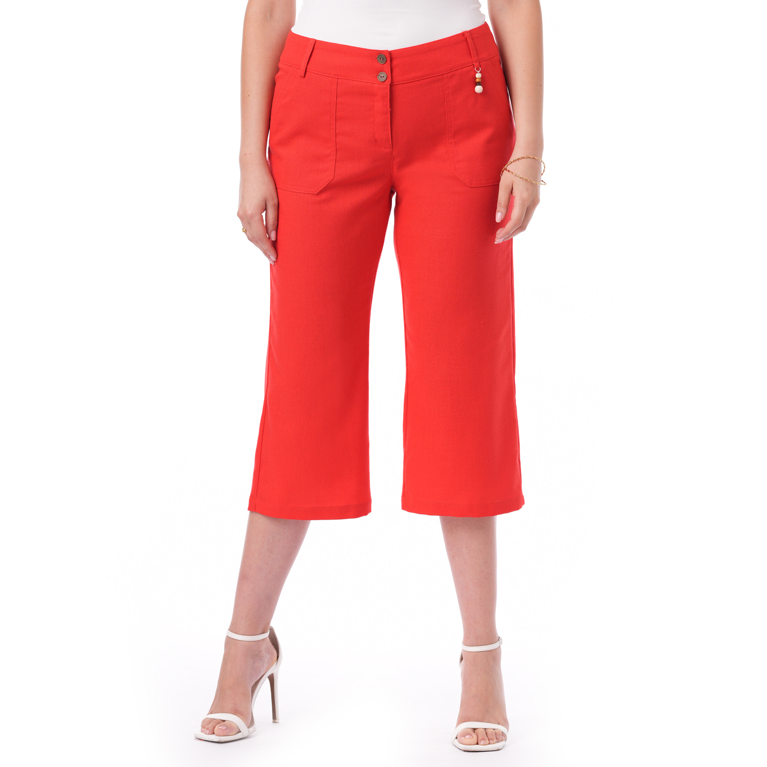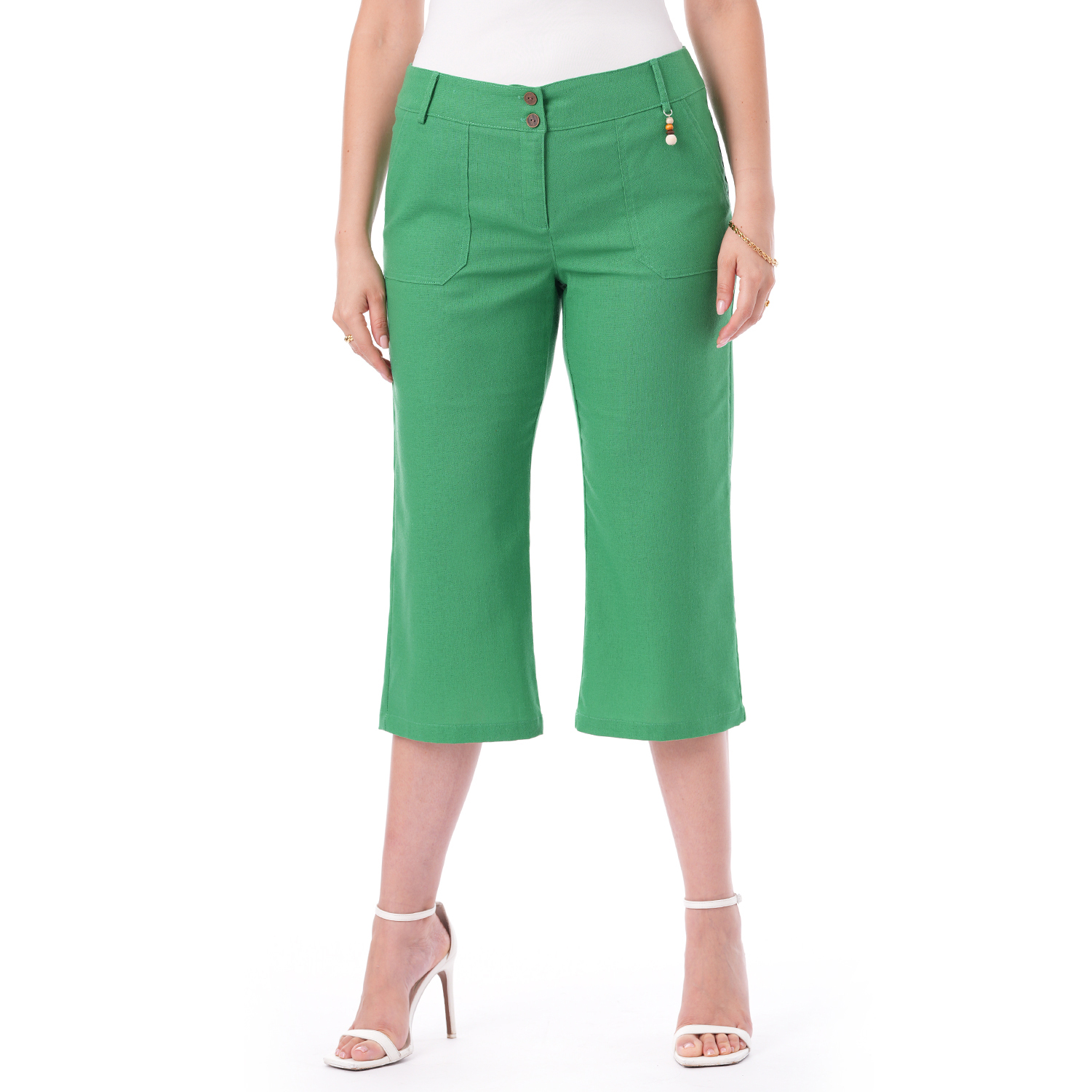 Este capri de color entero con bolsillos combina estilo y funcionalidad en una prenda versátil y fácil de llevar.