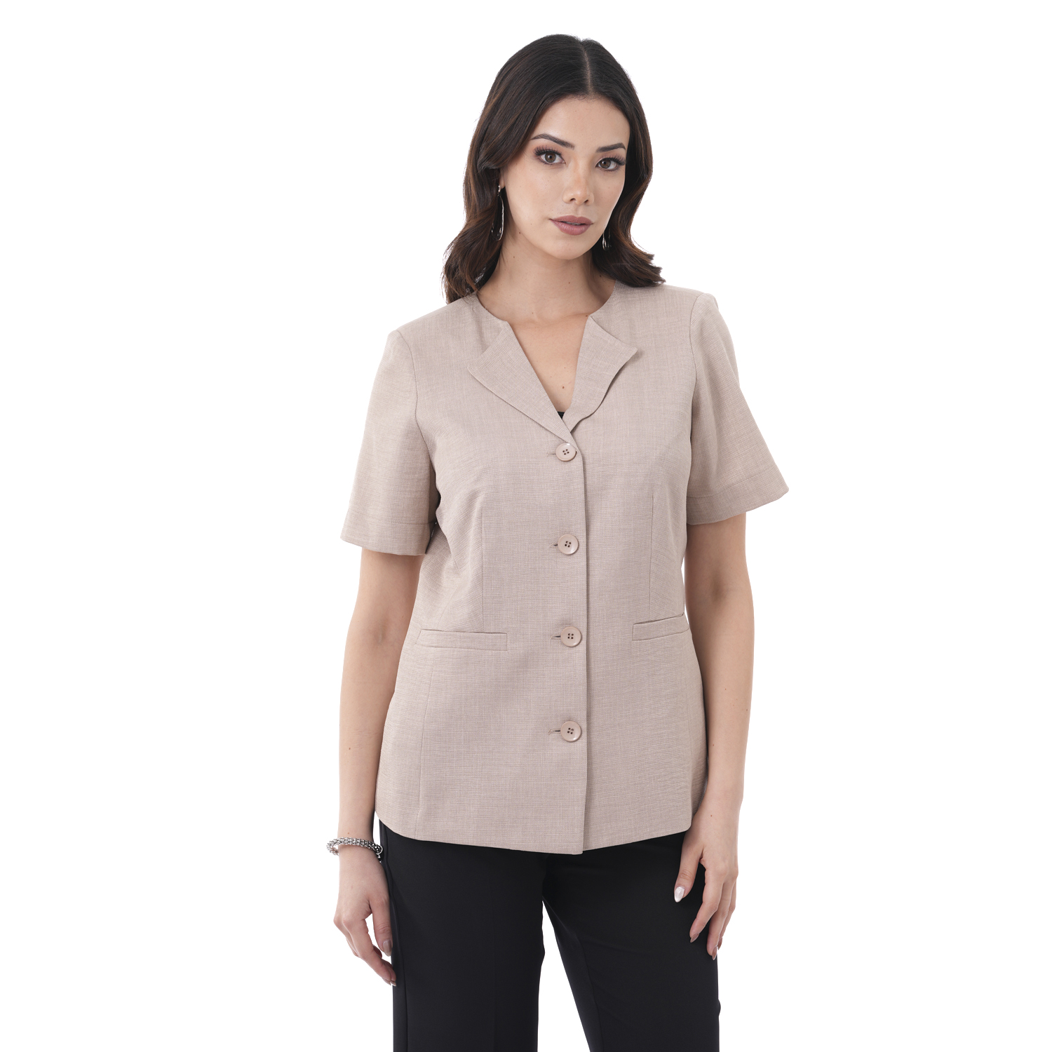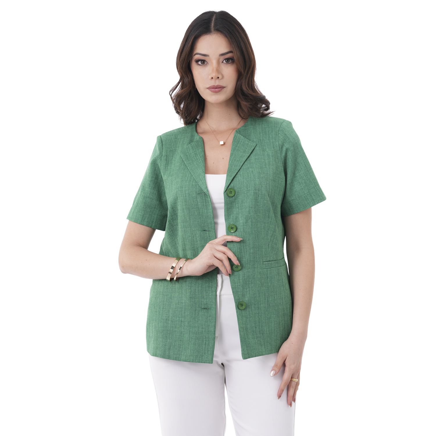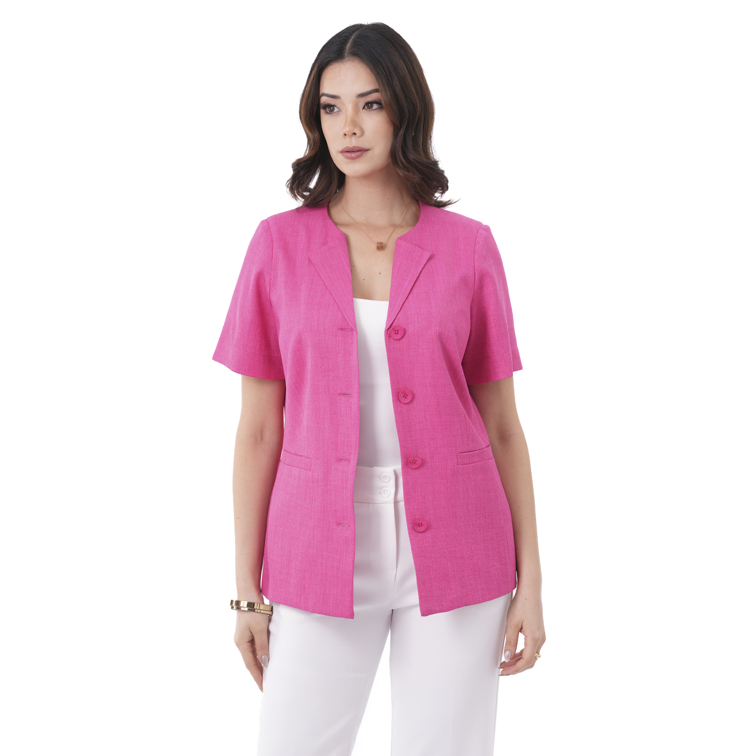 Esta chaqueta de manga corta y color entero destaca por su diseño. Su estructura elegante y líneas definidas la convierten en una prenda ideal para aportar sofisticación y modernidad a cualquier conjunto.