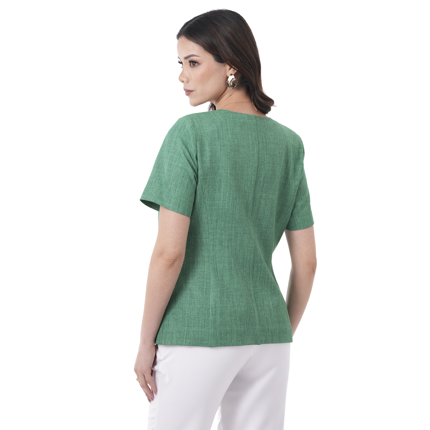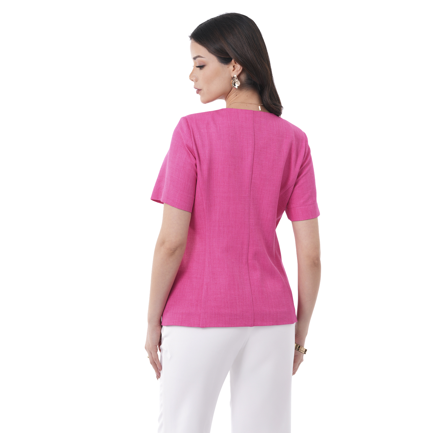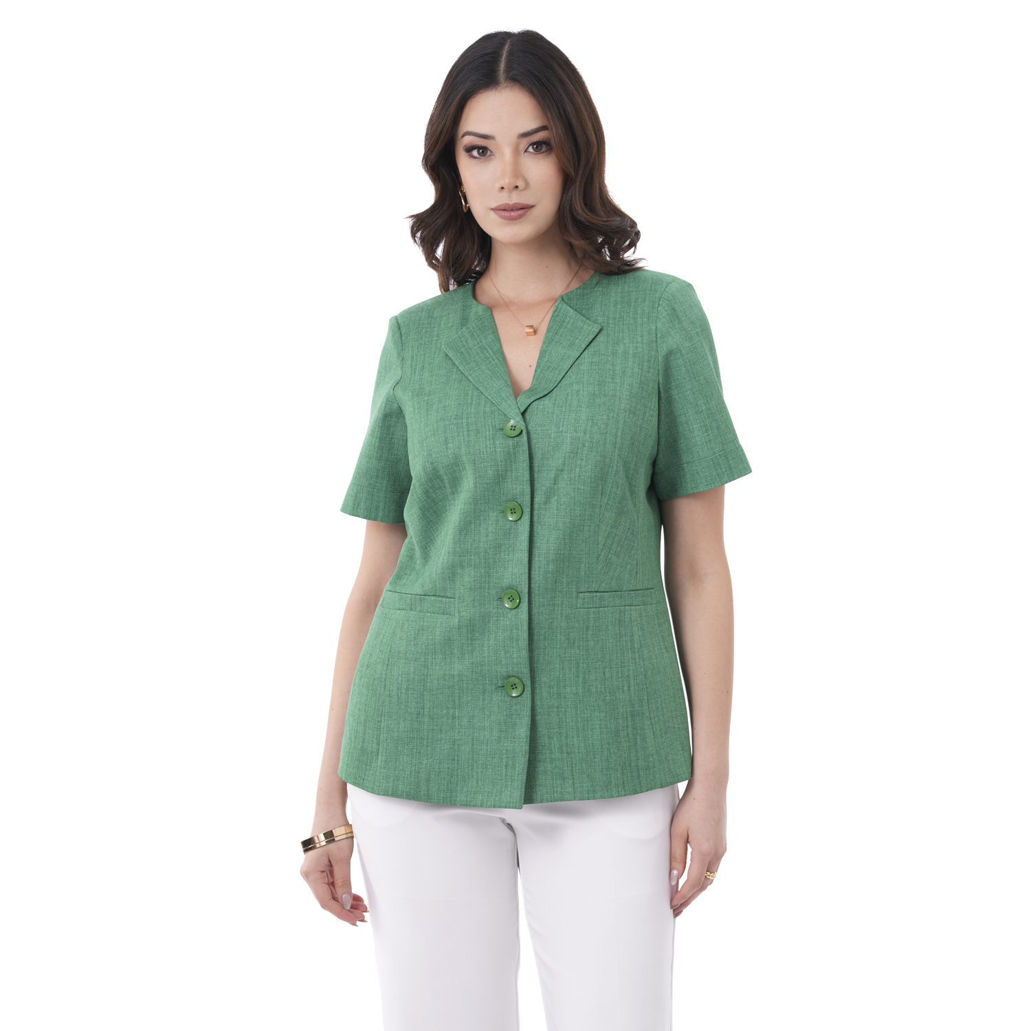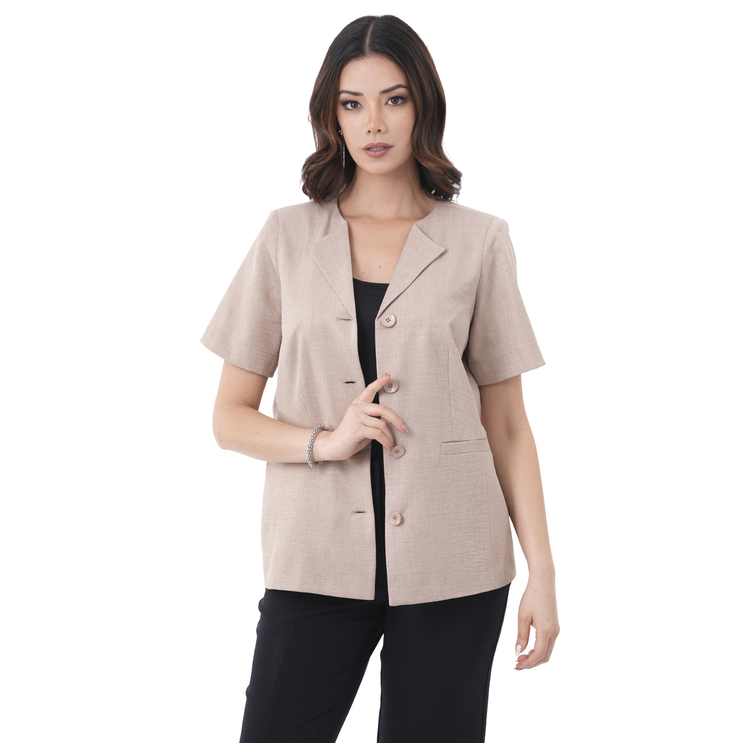Esta chaqueta de manga corta y color entero destaca por su diseño. Su estructura elegante y líneas definidas la convierten en una prenda ideal para aportar sofisticación y modernidad a cualquier conjunto.