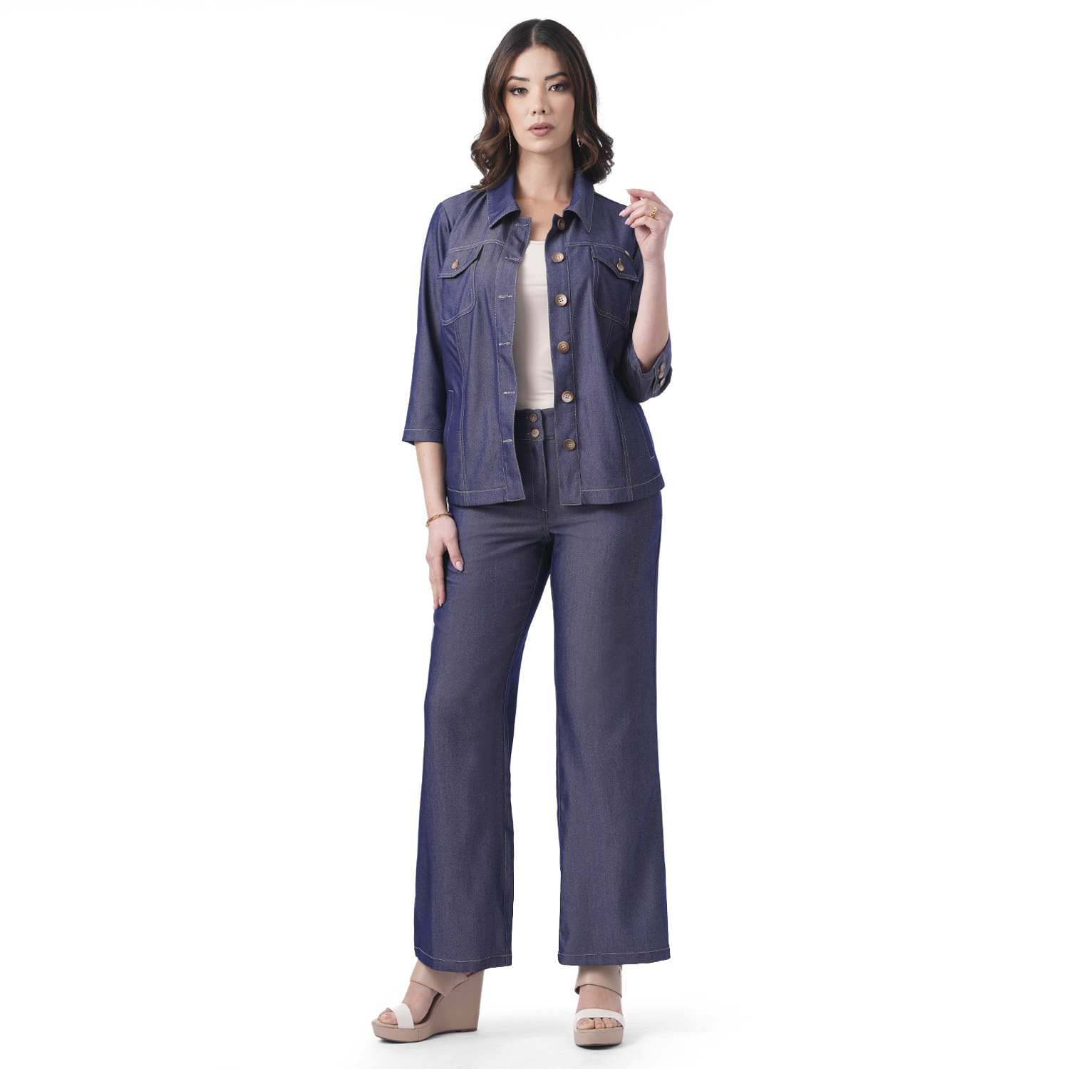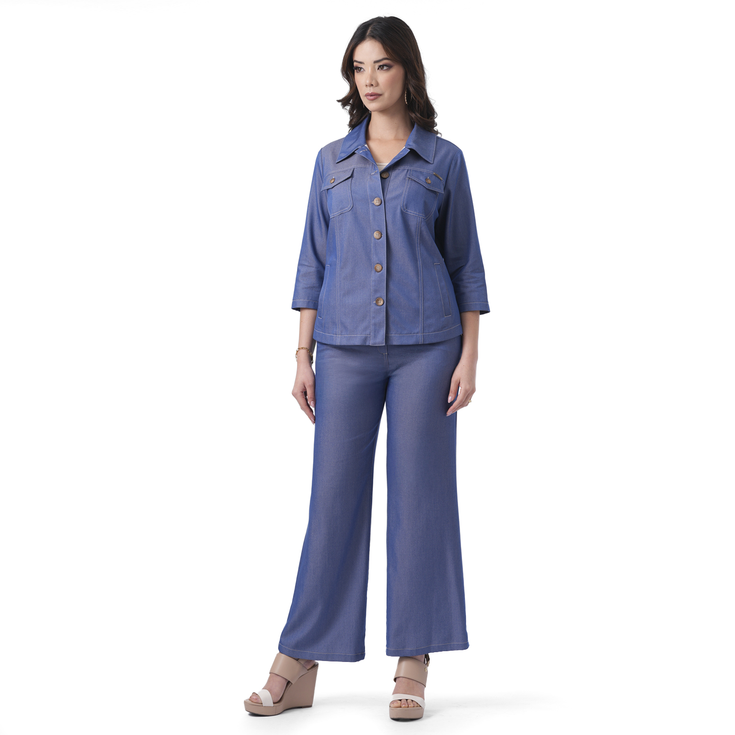 -Color azul y azulino: 70% viscosa, 30% poliéster.