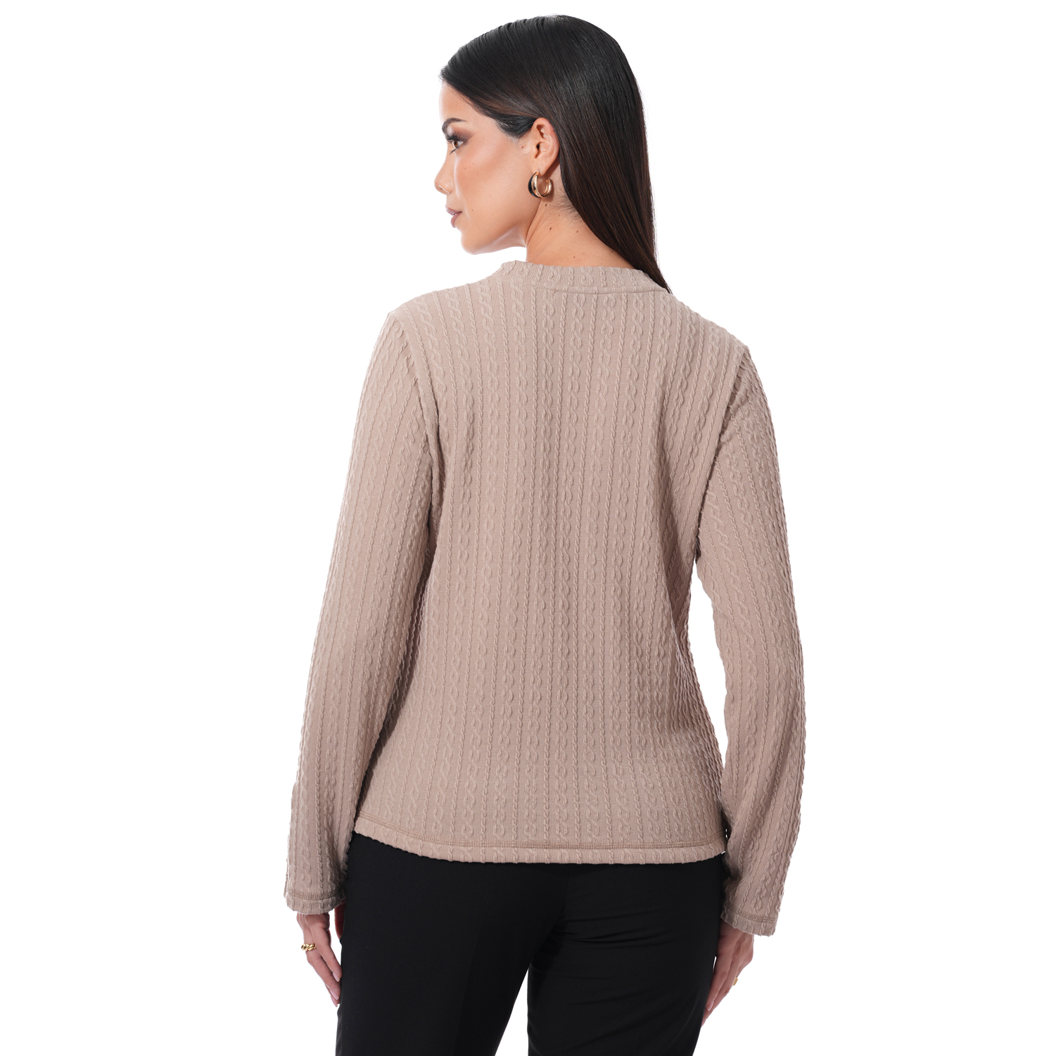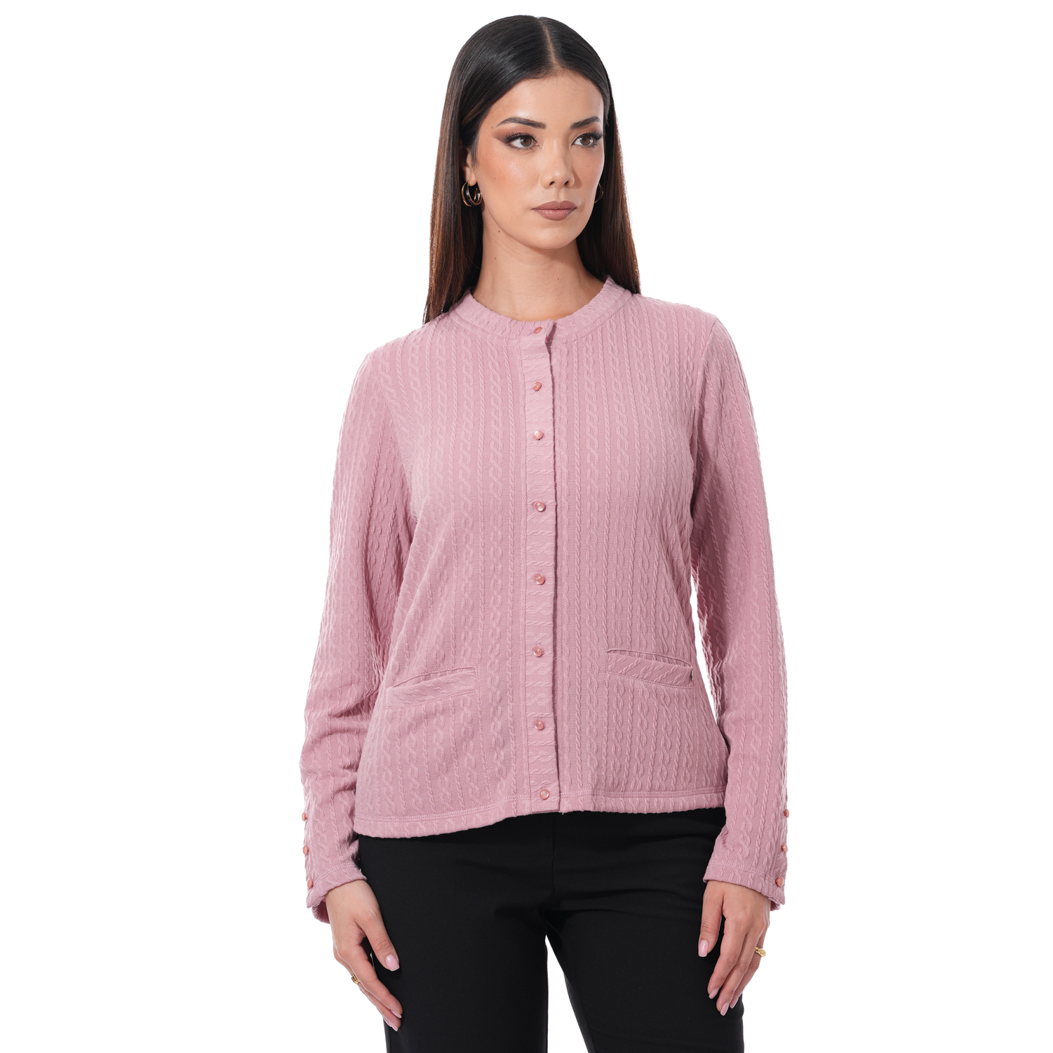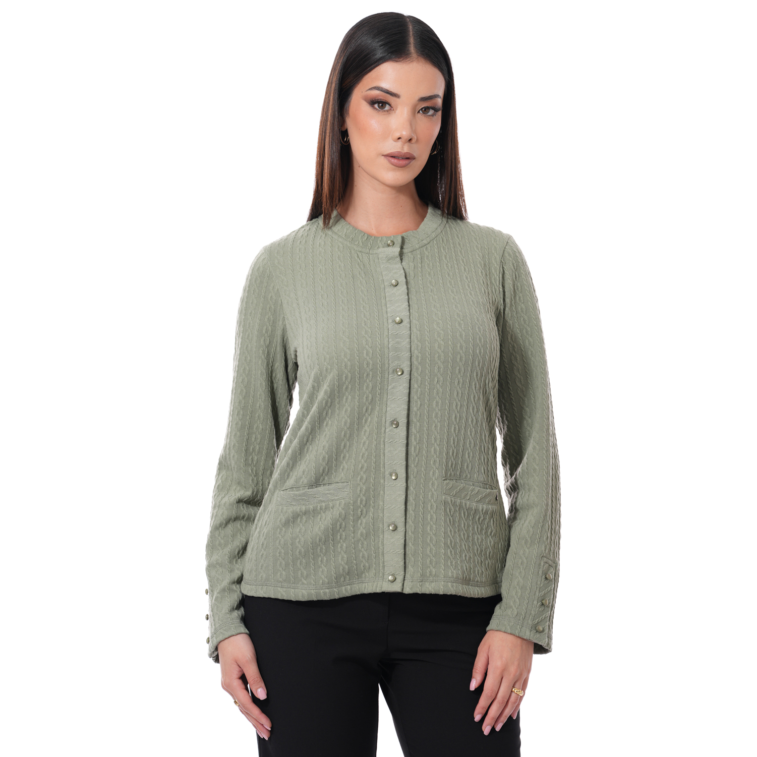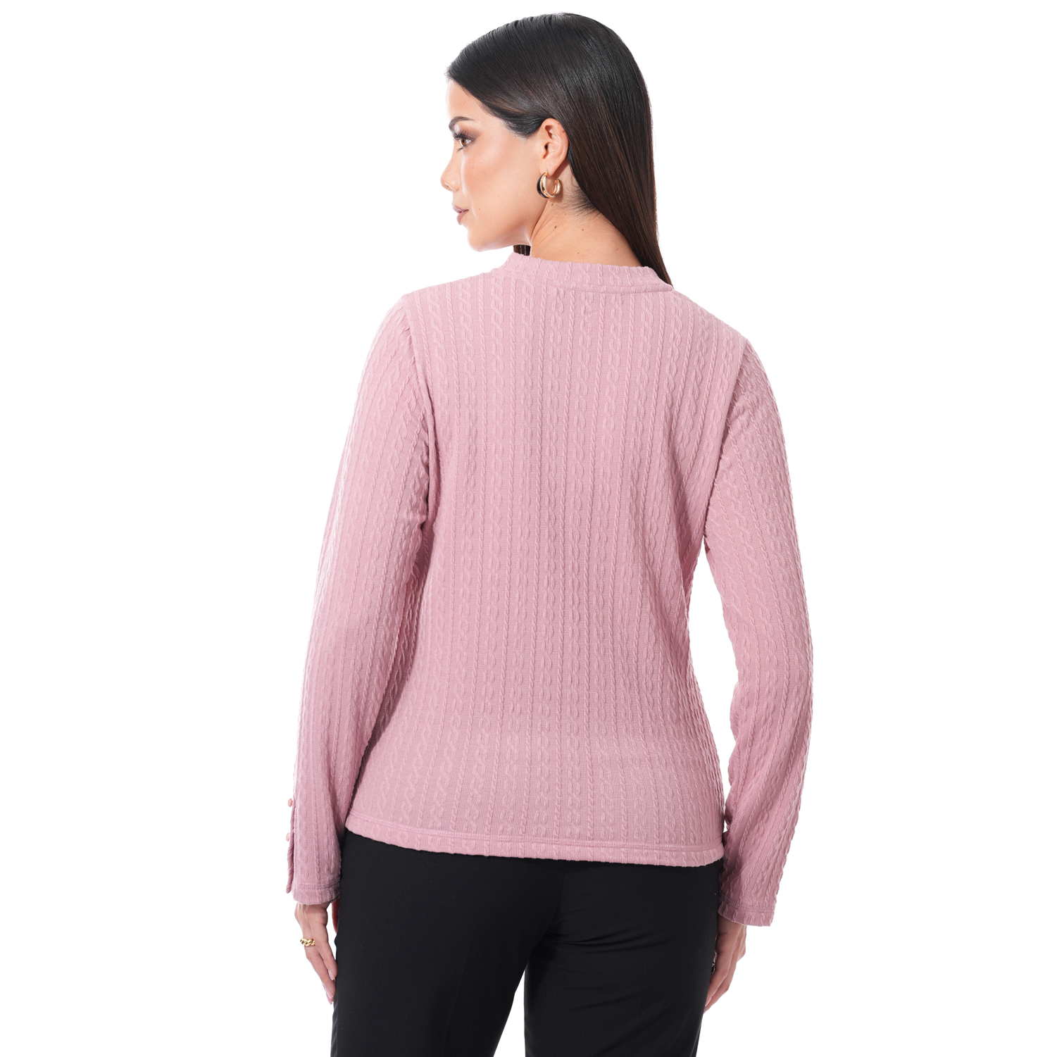 Esta chompa de color entero con botones combina elegancia y versatilidad en una prenda esencial.
