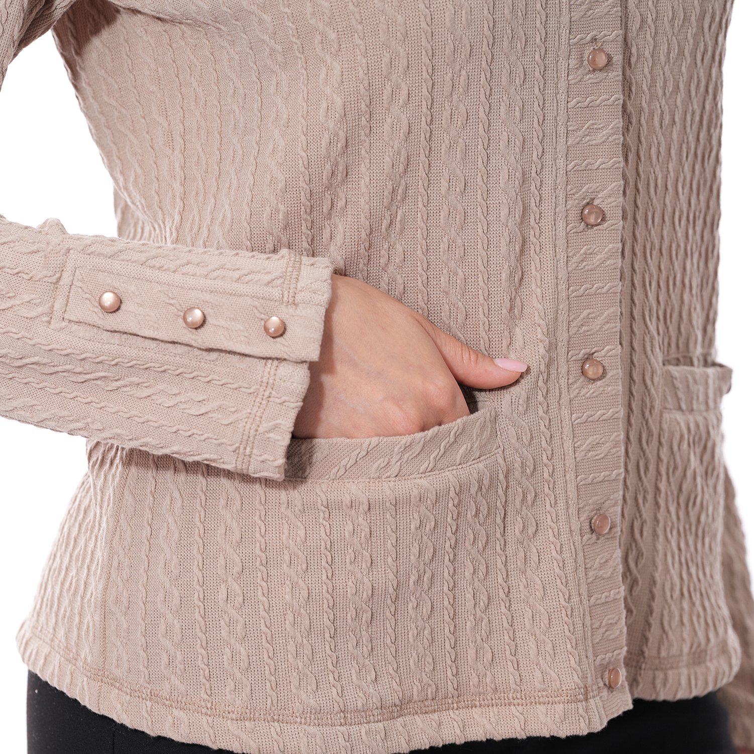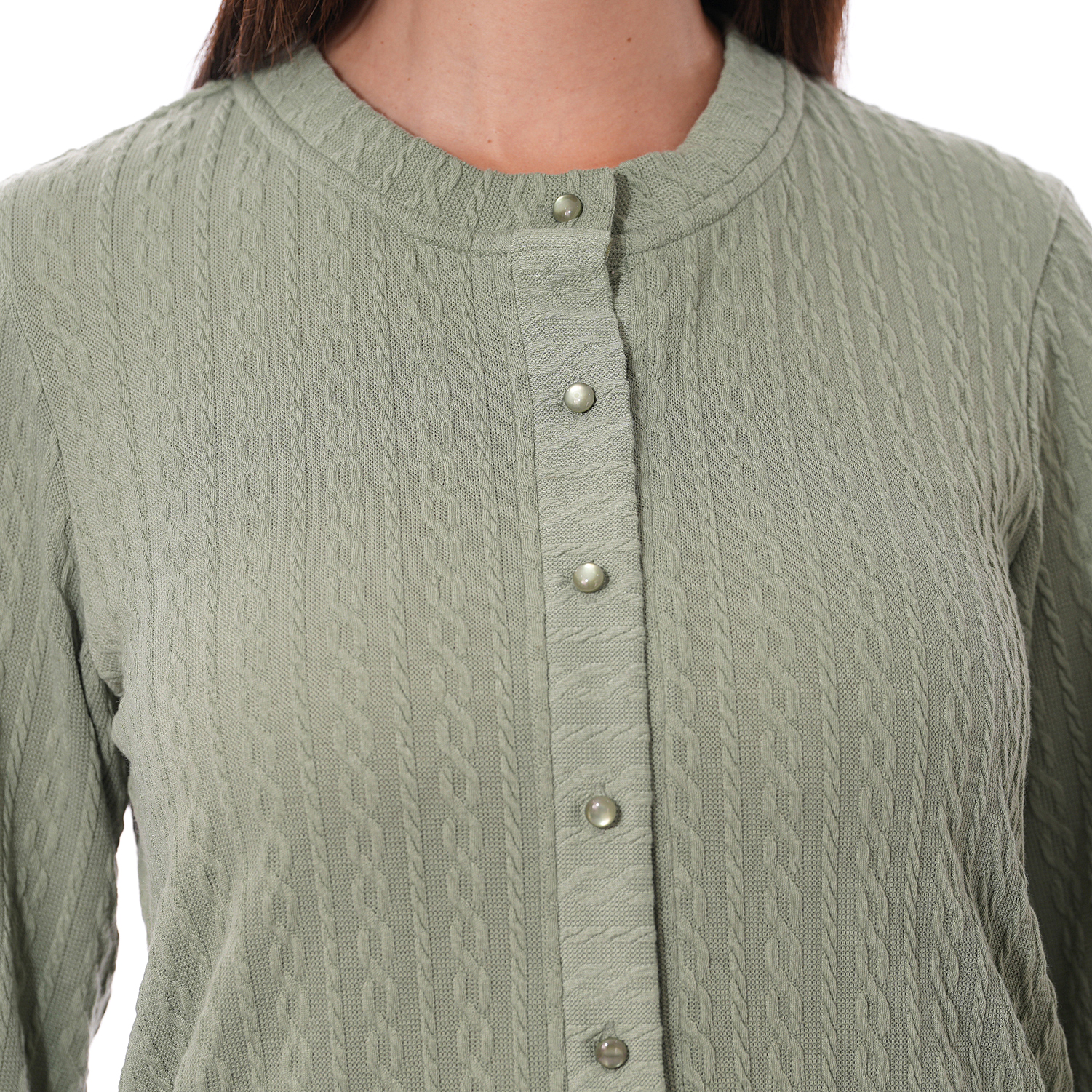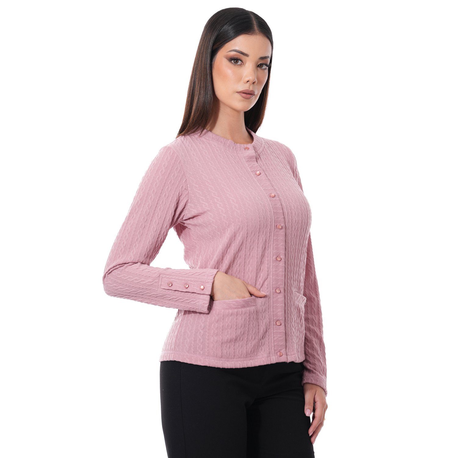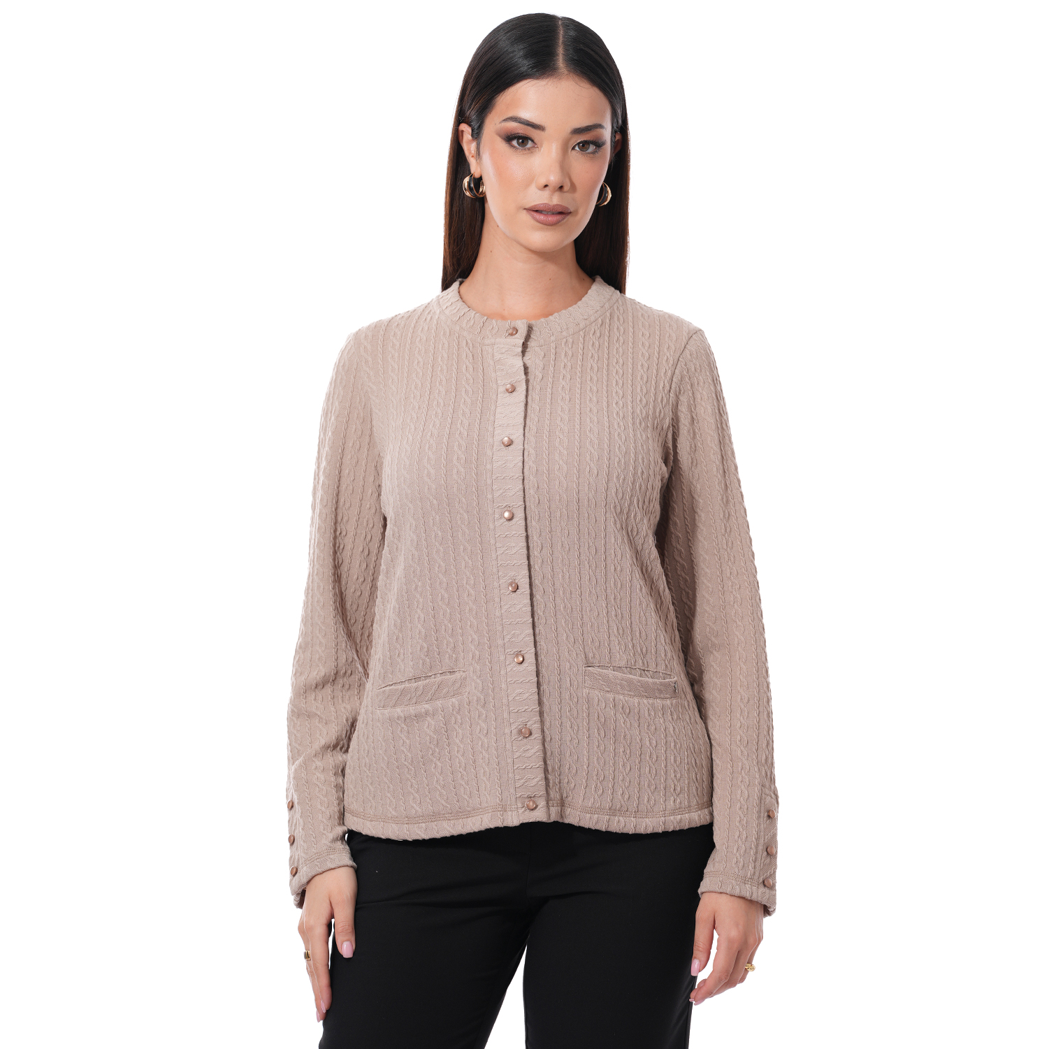 Esta chompa de color entero con botones combina elegancia y versatilidad en una prenda esencial.