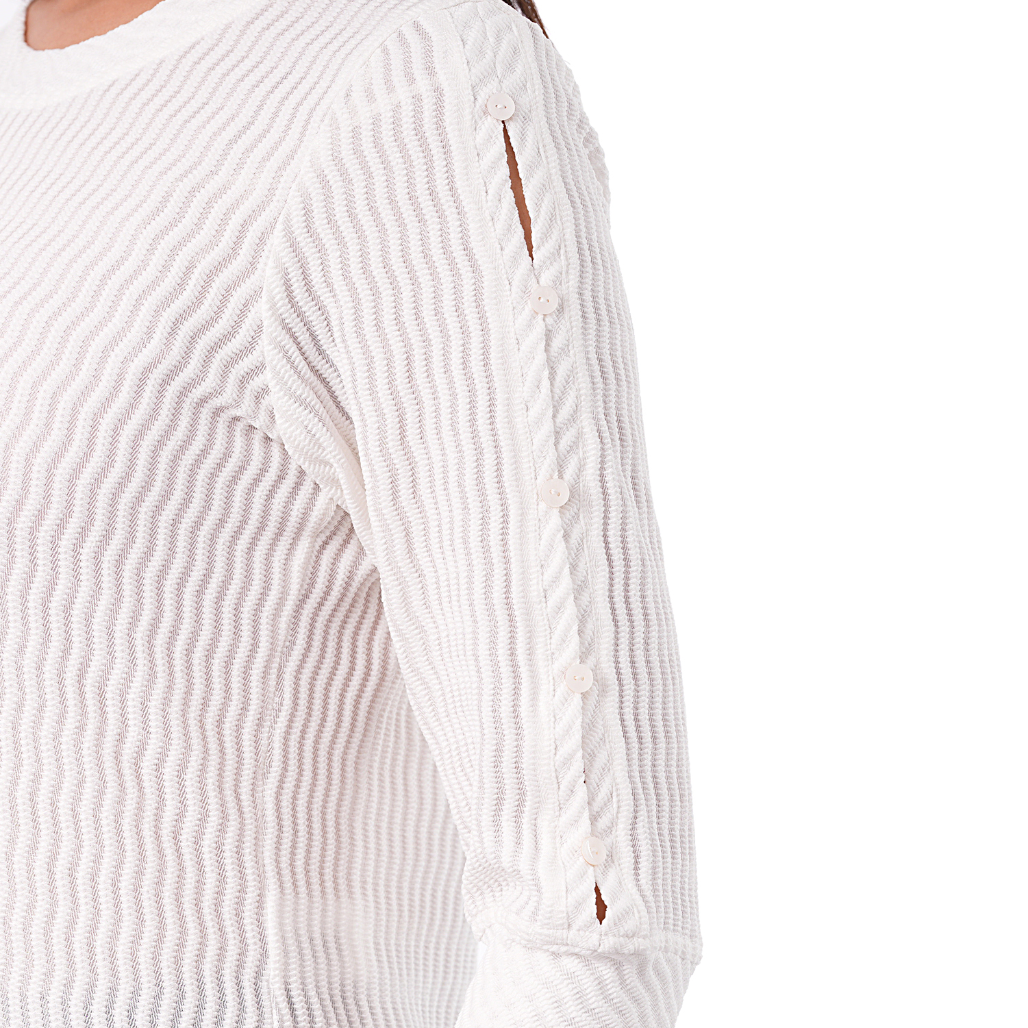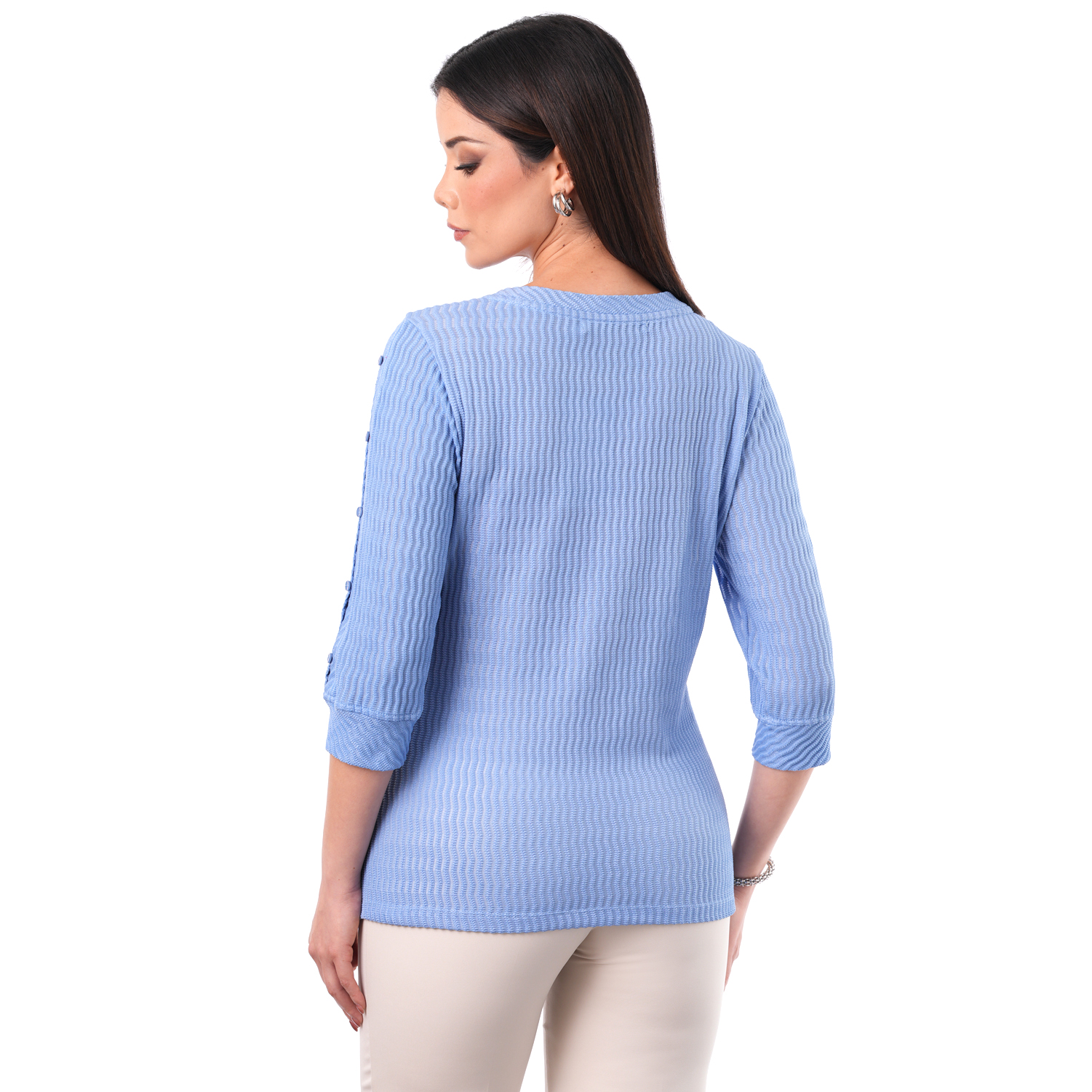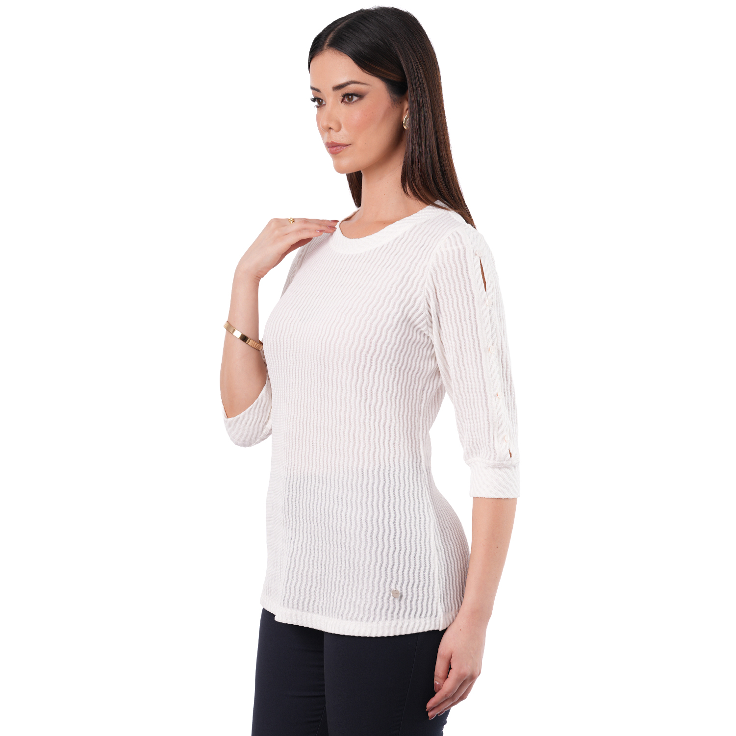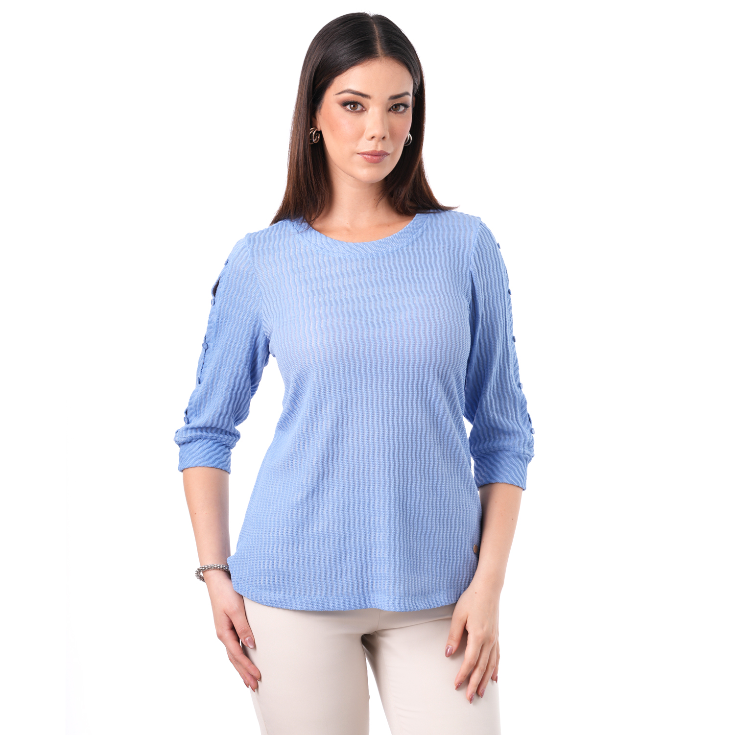 Esta chompa de color entero y manga 3/4 incorpora detalles en la manga que realzan el diseño, aportando un toque distintivo y versátil al look.