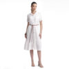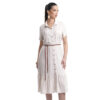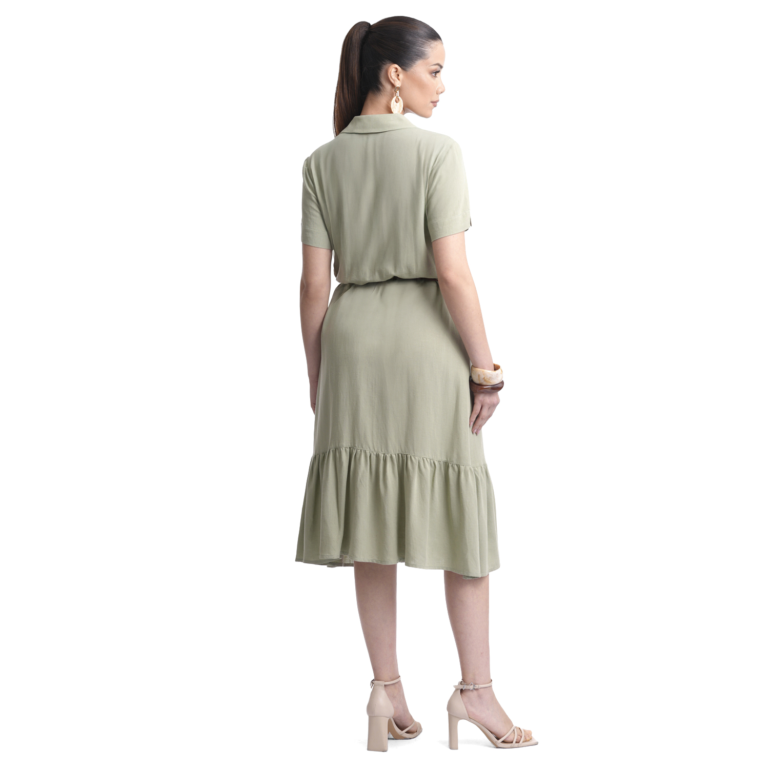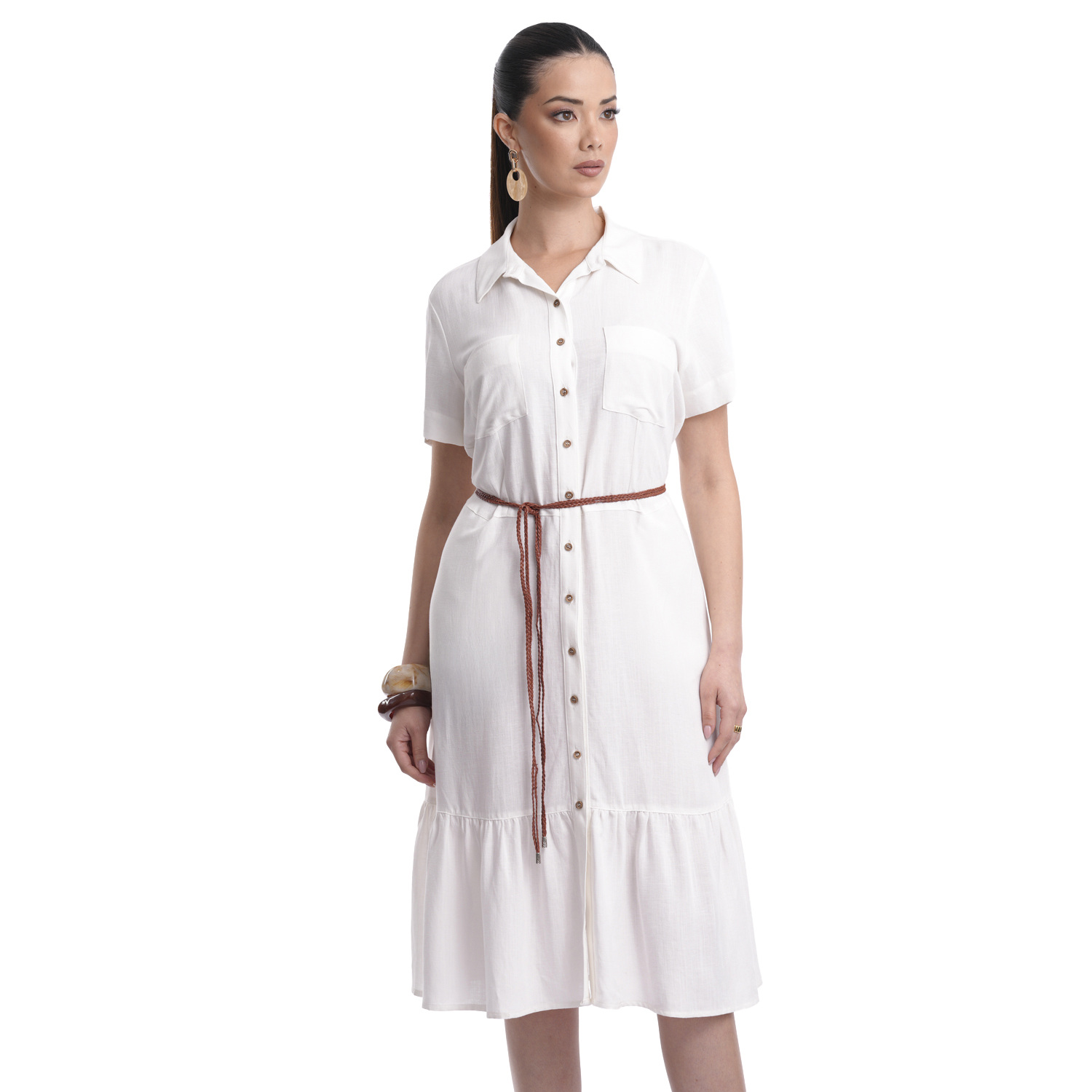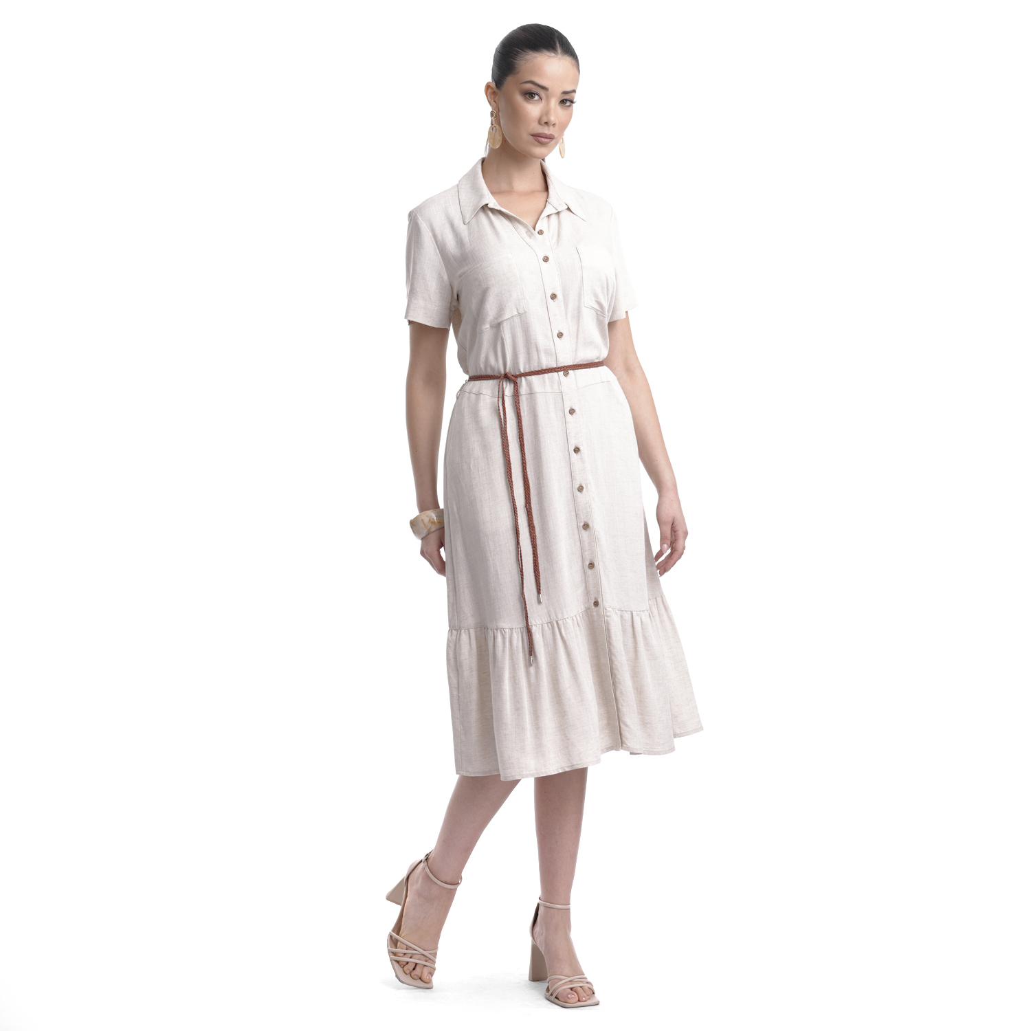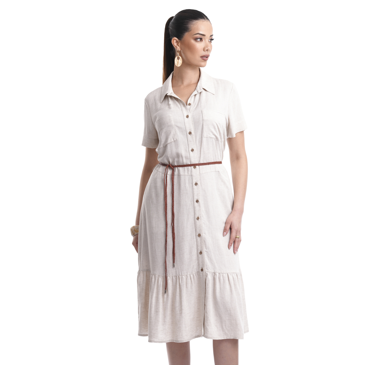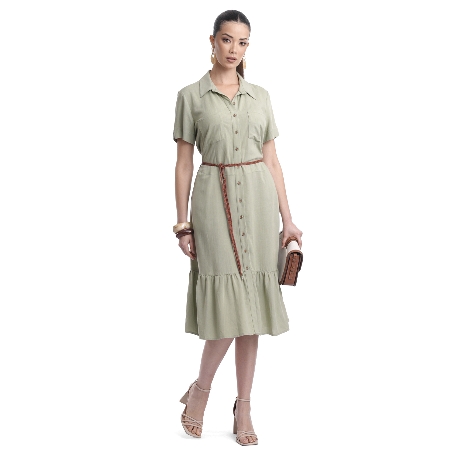 Este vestido color entero es una pieza cómoda y elegante. Su diseño de manga corta y correa incluida define la silueta con naturalidad, aportando un toque delicado que realza cualquier ocasión.